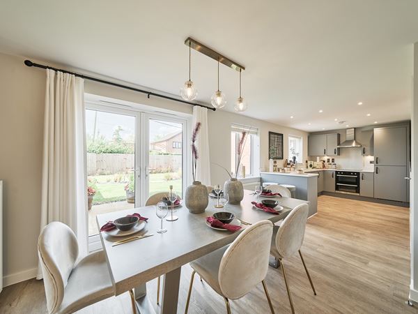 Modern open plan kitchen/diner with French doors leading into the garden